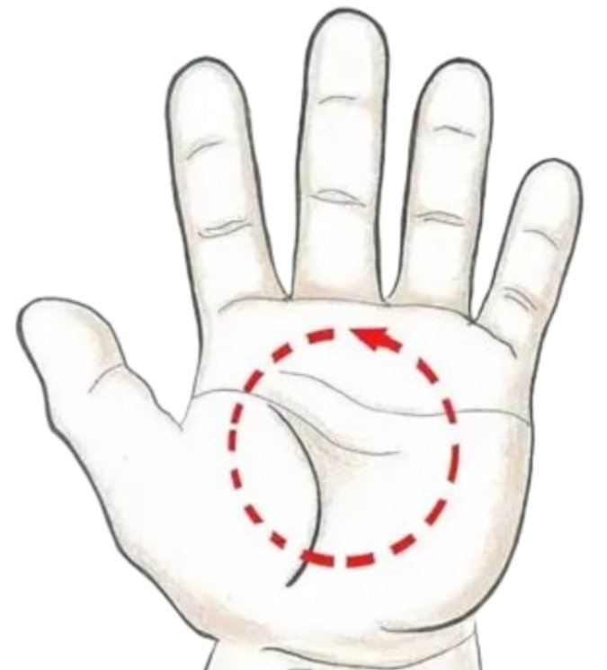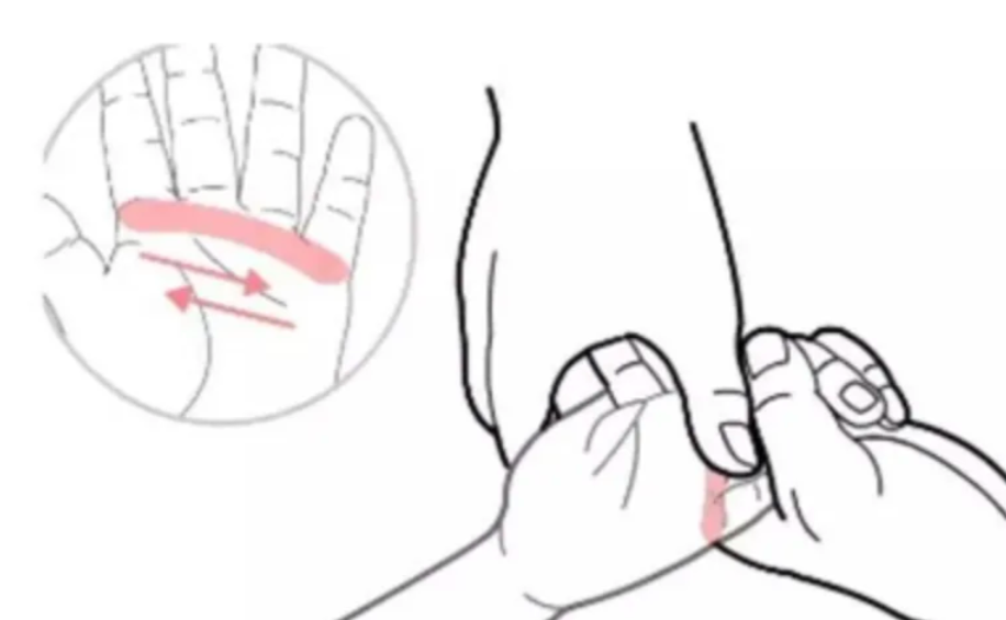 Operation essentials: Take the child’s left hand with the left hand, so that the child’s palm is facing up, and push counterclockwise with the outer edge of the right thumb. Time 2 minutes.