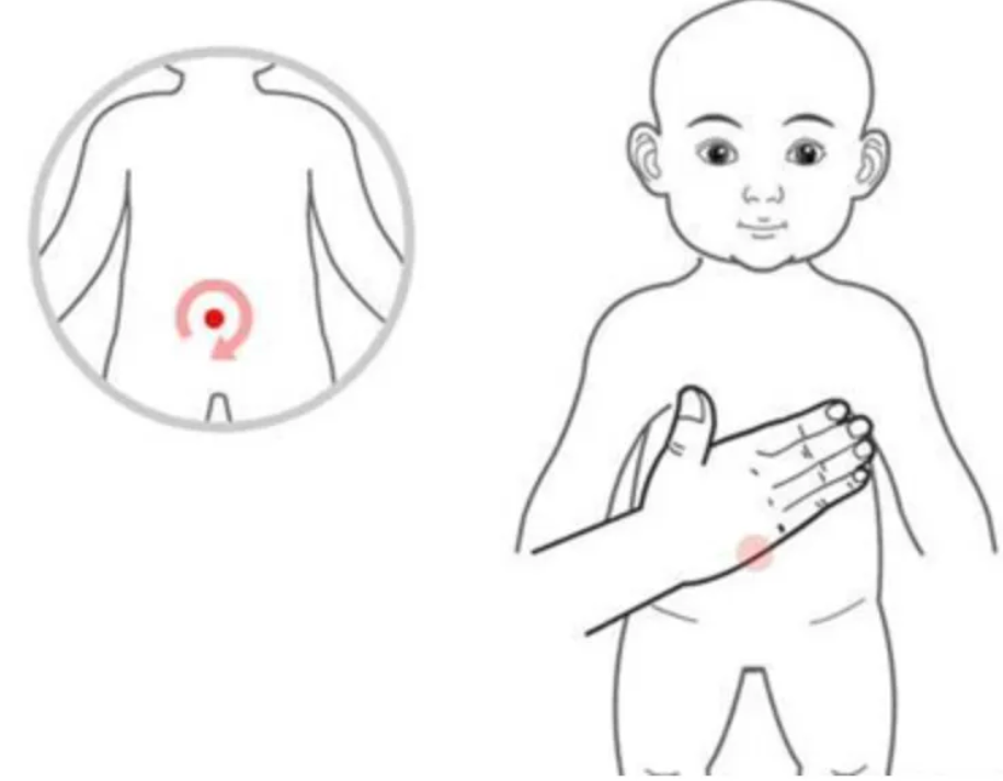Operation essentials: Place the palm of one hand on the child’s abdomen to do a clockwise circular abdominal rubbing. Time 3 minutes.